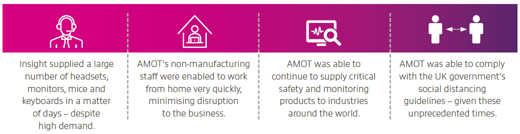 On this occasion, AMOT’s IT team made an urgent request to Insight for equipment to enable its workforce to work from home. Insight called across its distribution partners and vendors to find and reserve stock that could be supplied to AMOT as soon as possible.